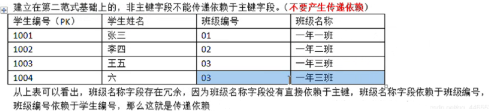 建立在第二范式基础上,非主键字段不能传递依赖于主键字段。(不要产生传递依赖)
