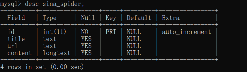 mysql> CREATE DATABASE sina_spider CHARACTER SET utf8;