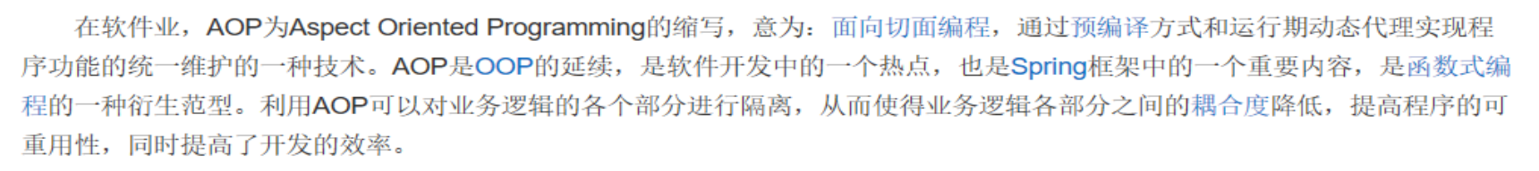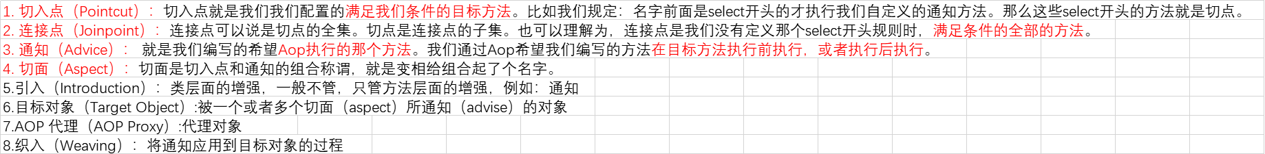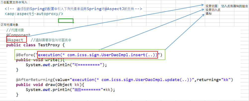 .xml文件需要加入: <bean id="man" class="com.icss.controller.Man"></bean> <bean id="fbi" class="com.icss.controller.FBI"></bean> <aop:config> <!--切入点(这里是 Man类中的 )--> <!-- <aop:pointcut id = "poincut1" expression = "execution(* com.icss.controller.Man.qq(..))"/>--> <aop:pointcut id = "pointcut1" expression = "execution(* com.icss.controller.Man.qq(..))"/> <aop:pointcut id = "pointcut2" expression = "execution(* com.icss.controller.Man.mm(..))"/> <aop:pointcut id = "pointcut4" expression = "execution(* com.icss.controller.Man.errfinal(..))"/> <!--<aop:pointcut id = "pointcut3" expression = "execution(* com.icss.controller.Man.err(..))"/>--> <aop:aspect ref = "fbi"> <!--这里是 FBI类中的--> <!--前置通知--> <aop:before method = "monitoring" pointcut-ref="pointcut1"></aop:before> <!--后置通知--> <aop:after-returning method="monitoringStop" pointcut-ref="pointcut1"></aop:after-returning> <!--环绕通知--> <aop:around method = "testArround" pointcut-ref = "pointcut2"></aop:around> <!--异常通知--> <!--<aop:after-throwing method="testThrowing" pointcut-ref="pointcut3" throwing="err"></aop:after-throwing>--> <!--最终通知 :无论是否有异常 总会将方法执行完毕--> <aop:after method="testAfter" pointcut-ref="pointcut4" ></aop:after> </aop:aspect> </aop:config>