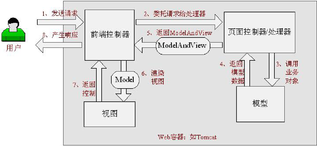 前端控制器再次收回控制权,将响应返回给用户,至此整个结束。