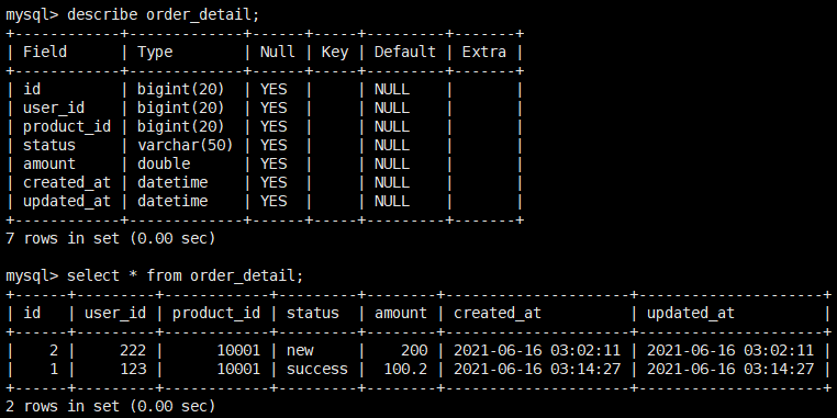 create table order_detail ( id bigint, user_id bigint, product_id bigint, status varchar(50), amount double, created_at datetime, updated_at datetime ) ;