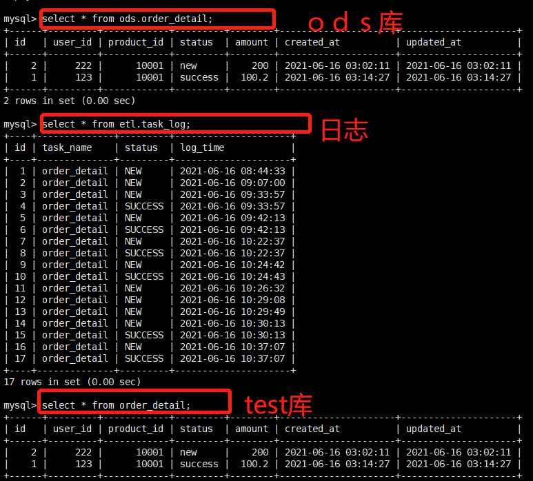 --================================ -- 测试数据 --================================ use test; drop table order_detail; create table order_detail ( id bigint, user_id bigint, product_id bigint, status varchar(50), amount double, created_at datetime, updated_at datetime ) ; insert into order_detail select 1, 123, 10001, 'new', 100.2, now(), now(); commit; --step2 insert into order_detail select 2, 222, 10001, 'new', 200, now(), now(); update order_detail set status = 'success' where id = 1; commit; select * from order_detail; create database ods;