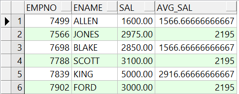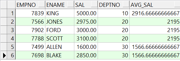 --需求-1: --查询出员工的姓名、工资、所在部门的平均工资, --要求显示出来的是工资大于部门平均工资的员工。 --1)连接查询的方式 SELECT e.empno, e.ename, e.sal, t.avg_sal FROM emp e, (SELECT deptno, AVG(sal) as avg_sal from emp GROUP BY deptno )t WHERE e.deptno = t.deptno AND avg_sal < e.sal; --2)分析函数--聚合函数+开窗函数 SELECT * FROM( SELECT empno, ename, sal, deptno, AVG(sal)OVER(PARTITION BY deptno) as avg_sal FROM emp ORDER BY deptno )t WHERE avg_sal < sal;