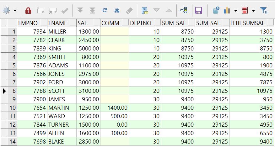 --需求-3: --按照部门求出各部门员工总薪水、所有员工薪水总和、按部门累计求和员工薪水 SELECT empno,ename,sal,comm,deptno, SUM(sal)OVER(PARTITION BY deptno)sum_sal, SUM(sal)OVER()sum_sal, SUM(sal)OVER(PARTITION BY deptno ORDER BY sal) leiji_sumsal --累计求和 FROM emp;