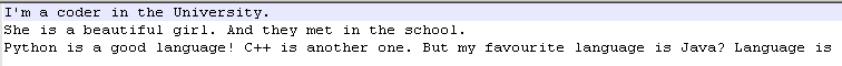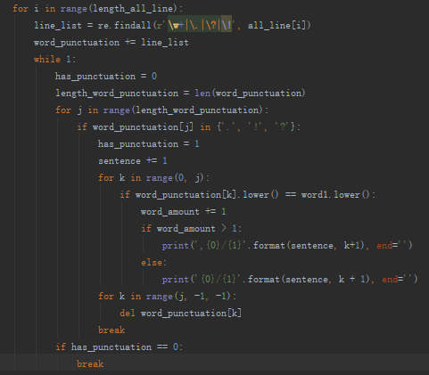 (2)判断列表中是否有句号、问号、感叹号,有的话则从该句子中找出要查找的单词的位置,然后将这句话从列表中移除,列表中剩下的单词保持不变,然后读入下一行数据并放入列表中,如此循环至文件最后一行。