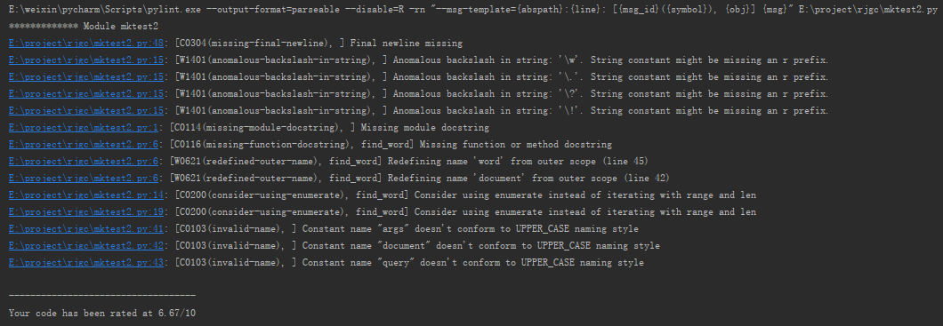 首先用pip install pylint安装了代码规范性检查工具,然后参考 https://blog.csdn.net/suzyu12345/article/details/80323067 在pycharm中进行了pylint相关配置,最后采用pylint对mktest2.py进行了代码规范性检查,结果如下,存在很多不合理的地方。