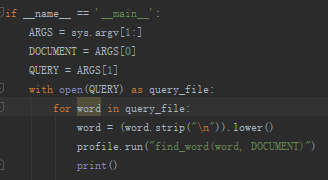 可以看到lower()函数占用了很多时间,然后就想着从这个地方对代码进行优化。下图倒数第五行为lower函数使用的位置,可见其处于循环中,通过分析得到word1是需要查找的单词,word1.lower()使用的次数等于循环次数,若将其放在循环外,word1.lower()就只需要使用一次。