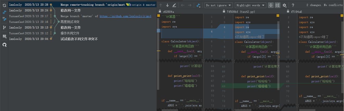(2)尝试了两个人操作不同文件,冲突时会发生如下图所示情况,合并就好了;