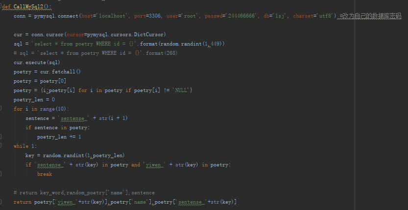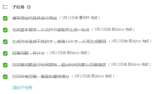 2)所有的编程人员都是乐观主义者,在编写程序的时候,我们都会对自己的代码有很高的期待,希望没有错误出现,但在实际编写过程中,难免存在一些思想上的缺陷,导致出现一些bug。比如说在编写诗词大赛程序的时候,我们小组是从json中读取结构化的一些诗词,然后从中随机挑选出诗句,编写完这一部分代码后,运行一两次也没有出错,就决定自己程序没问题,很不错,但重复运行多次之后偶尔就会发生一些错误,比如列表索引超出下标范围,后来就发现从网上获取的json文件中部分诗词只有题目,没有句子,就导致产生了这个bug,然后就修改了代码解决了这个问题,所以在我们写代码的时候要给自己预留一些调试、修改bug的时间,有自信是好的,但不要太过自信。