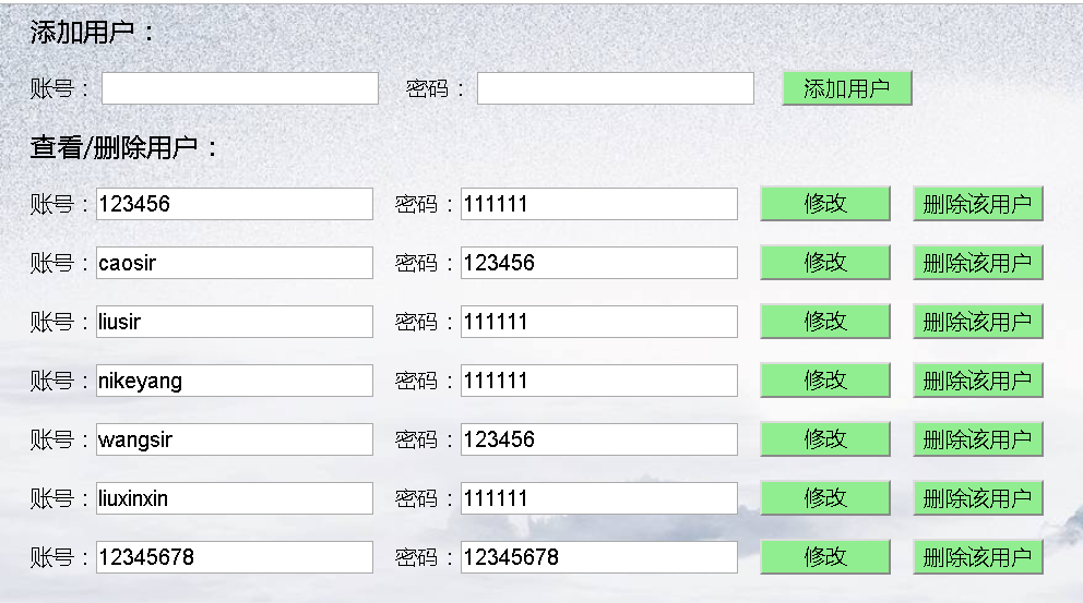2、管理员登录示例,管理员登录成功后跳入账号管理界面,如下图所示,管理员可以对用户账号及其密码进行修改,可以删除用户账号,也可以添加用户账号: