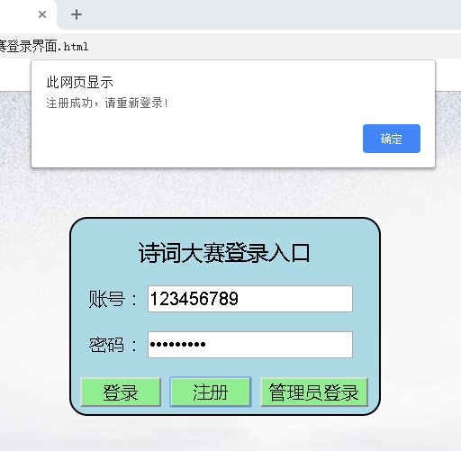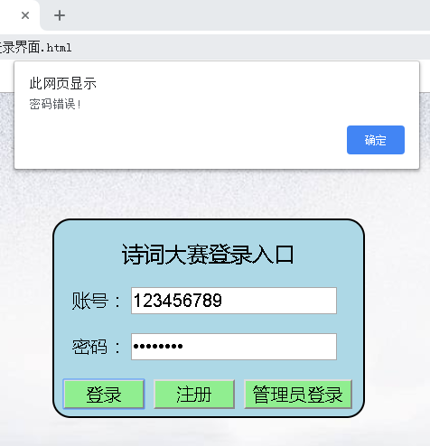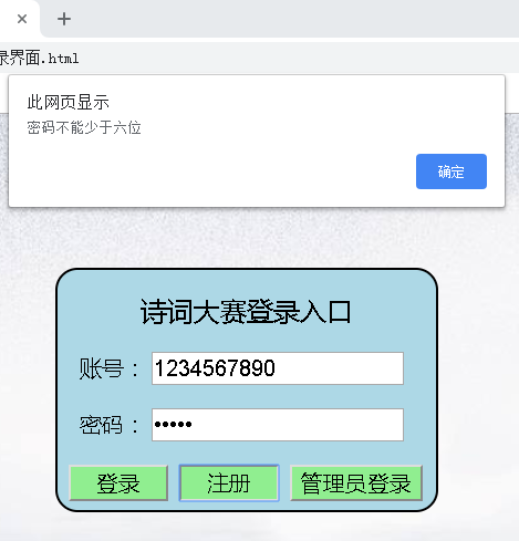 1、登录界面如下,可以进行用户的注册和登录,也可以进行管理员的登录,当密码错误时会有提醒,密码不足六位时也会进行提醒;