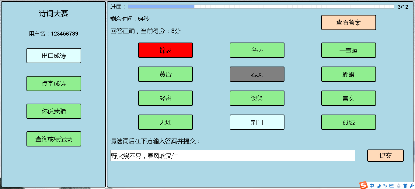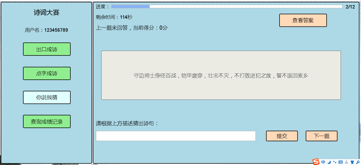 6、点击你说我猜,进入你说我猜界面,如下图所示,可以通过在文本框中输入答案进行提交,其余功能与出口成诗类似,当超时或完成所有回答时跳入”回答情况总结“界面。