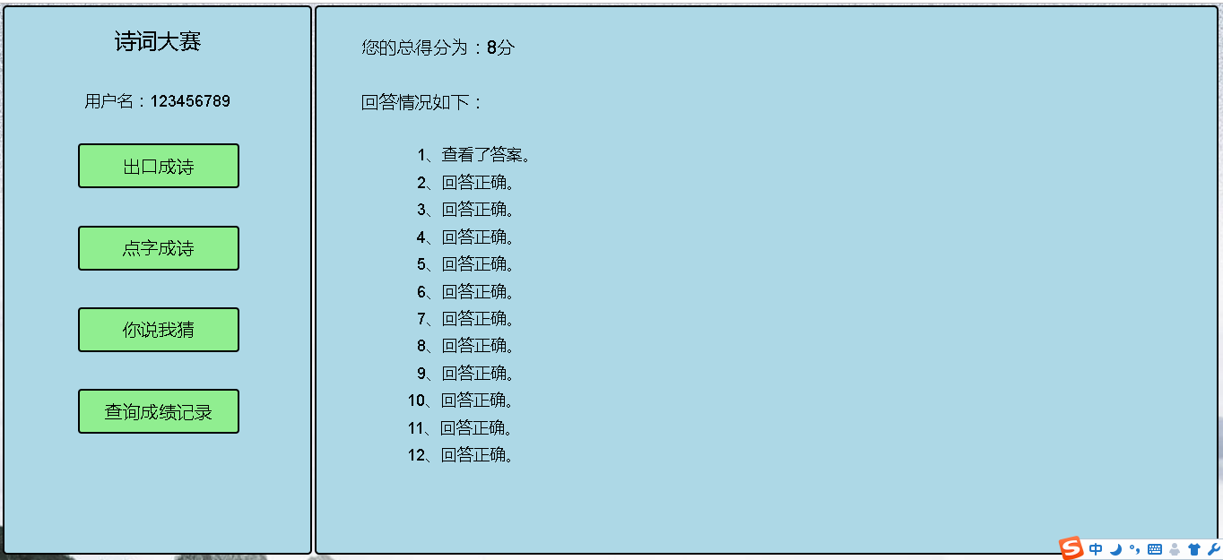 当超时或完成所有回答时跳入”回答情况总结“界面,如下图所示,主要显示本次回答情况以及最终得分。