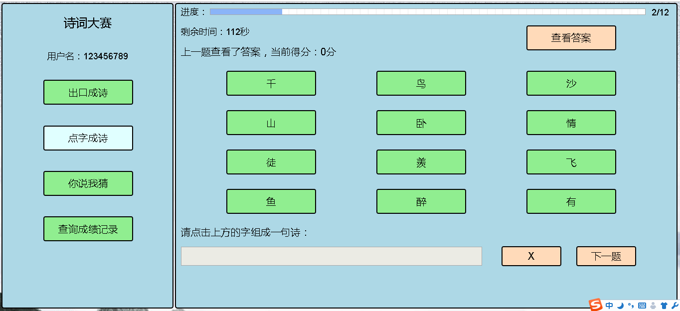 5、点击点字成诗,进入点字成诗界面,如下图所示,可以通过点击相应的字来进行回答,可以通过点击”x"删除刚才点击的字,也可以点击“下一题”直接进入下一题,其余功能与出口成诗类似,当超时或完成所有回答时跳入”回答情况总结“界面。