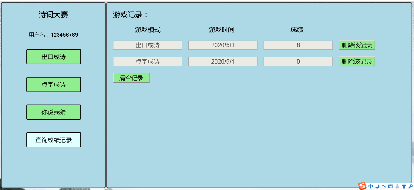 7、点击查询成绩记录时进入成绩记录界面,如下图所示,用户可以删除某一条记录,也可以直接清空所有记录。