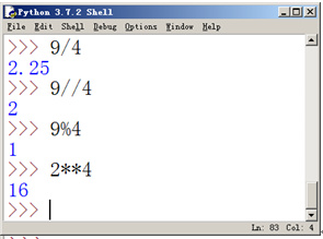 其中除运算的结果一般不再是整数,比如在Python解释器窗口的提示符后面输入 9/4,回车后显示为2.25,但若输入9//4则结果显示为2,表示9除以4后的商是2(小数被丢弃). 若输入9%4,则显示为1,表示9除以4余数是1,若输入2**4则结果显示为16,表示2的4次方是16,参见下图。