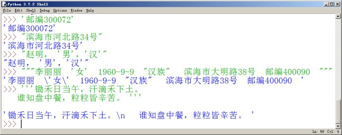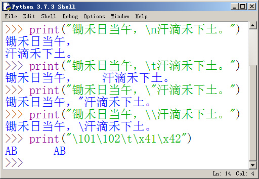 在Python解释器窗口的提示符后面输入上面各字符串均可以得到正确的输出。参见下图。绿色文字是输入的内容,蓝色文字是输出的内容。其中的代表字符中的换行标记。