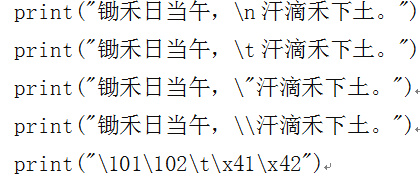 第五条语句中的“\101”中的101是八进制,相当于十进制的65,正是大写字母A的ASCII码,所以在输出时“\101”显示为A,同理“\102”显示为B,符号“\x41”中的x41表示是十六进制数,十六进制的41相当于十进制的65,也就是字母A的ASCII码,所以也显示为字母A,同理,“\x42”显示为字母B。