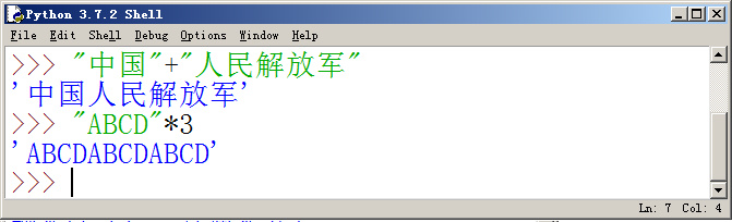 能用于字符串运算的有四个运算符号,分别是“+”、“*”、“in”和“not in”,其中“+”用于连接字符串,“*”用于重复原有的字符串,比如:在Python解释器窗口的提示符后面分别输入下列内容,并按回车键,结果如下图所示。