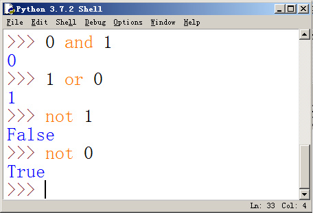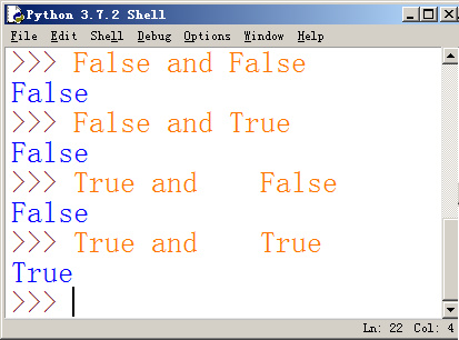 “逻辑与”运算的规则用一句话来概括就是:有假则假,即参与“逻辑与”运算的两个逻辑值,只要其中有一个值是“False”则结果就是“False”。在Python解释器窗口提示符后输入下列各逻辑运算式,可得到其运算结果。如下图所示。