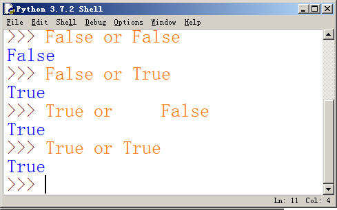 “逻辑或”运算的规则用一句话来概括就是:有真则真,即参与“逻辑或”运算的两个逻辑值,只要其中有一个值是“True”则结果就是“True”。在Python解释器窗口提示符后输入下列各逻辑运算式,可得到其运算结果。如下图所示。