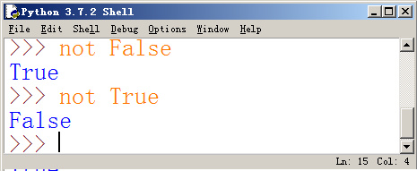 逻辑“非”运算的含义是对当前逻辑值的否定,因此运算时只需要一个逻辑值,运算结果和当前参与运算逻辑值相反。在Python解释器窗口提示符后输入下列逻辑非的运算式,可得到如下图所示的运算结果。