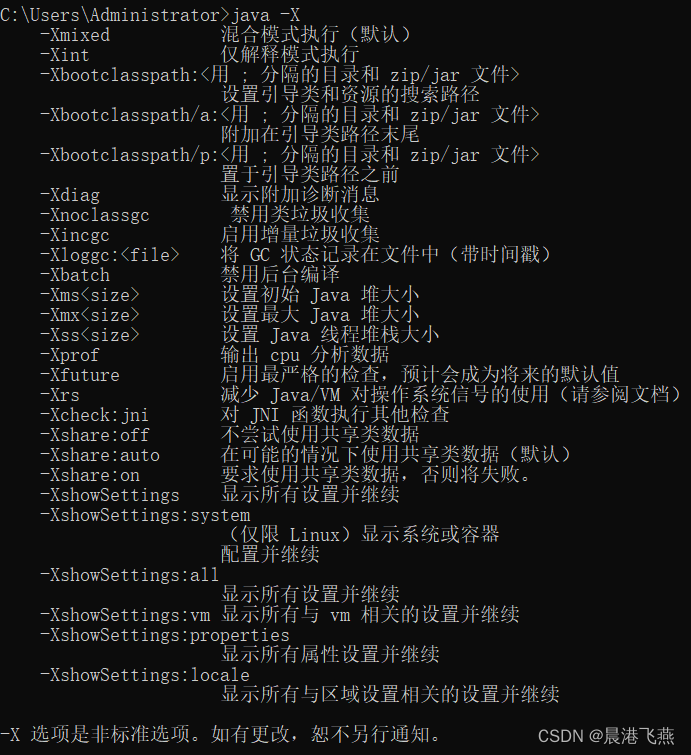 非标准选项:以“-X”开头,特定于Java HotSpot 虚拟机的通用选项,因此不能保证所有 JVM 实现都支持它们,并且可能会发生变化。