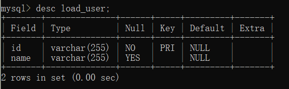 如下面例子所示:创建数据表load_user,有两个属性。如下所示:
