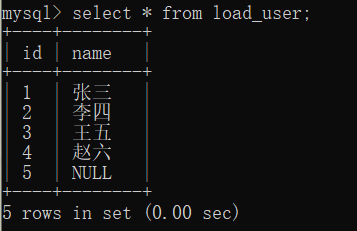 load data infile "e:/load_user.txt" into table load_user(id, name);