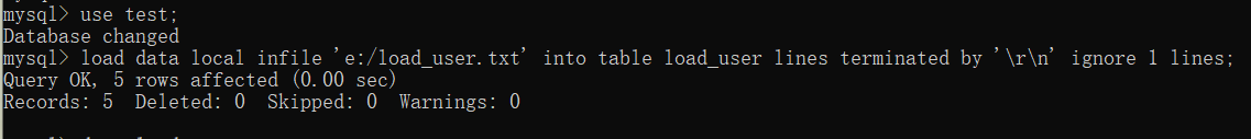 load data local infile 'e:/load_user.txt' into table load_user lines terminated by '\r\n' ignore 1 lines;