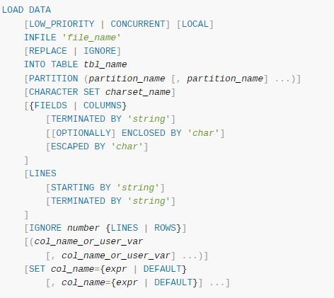 这个命令与mysqlimport非常相似,但这个方法可以在mysql命令行中使用。也就是说您可以使用API程序调用这个命令,如mysqlimport工具一样,这个命令也有一些可以选择的参数
