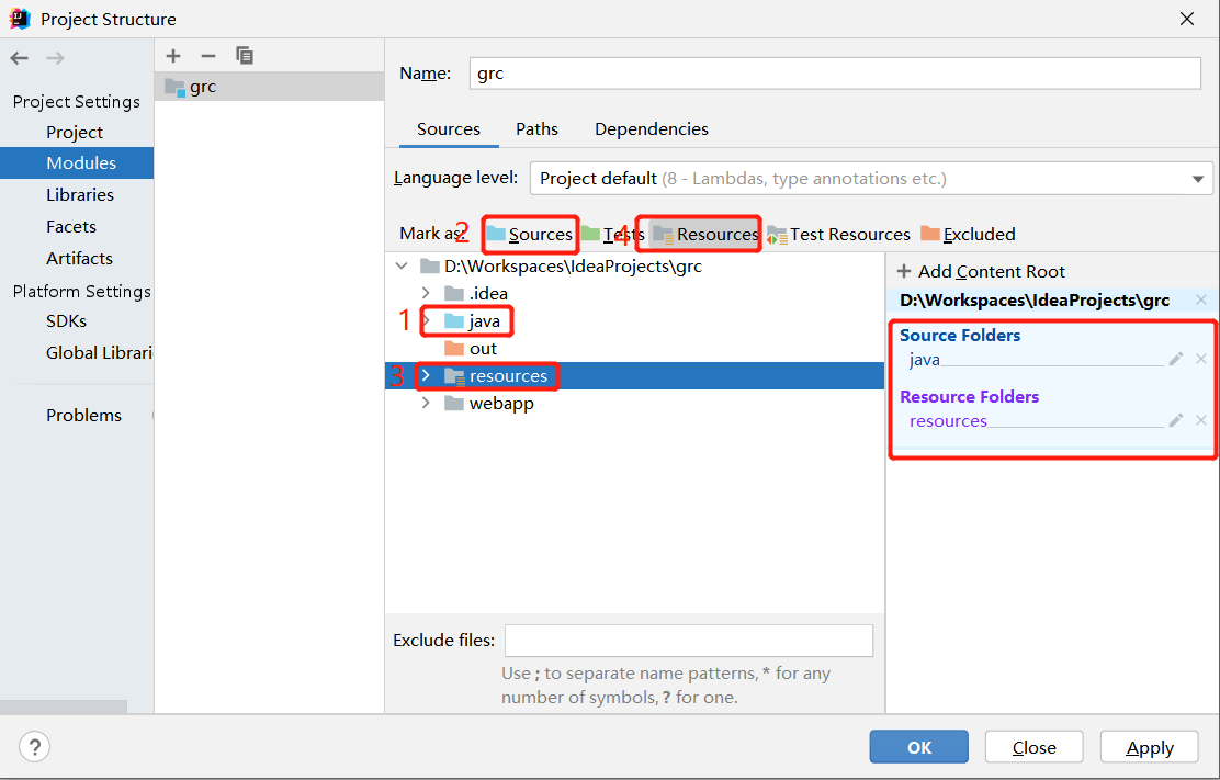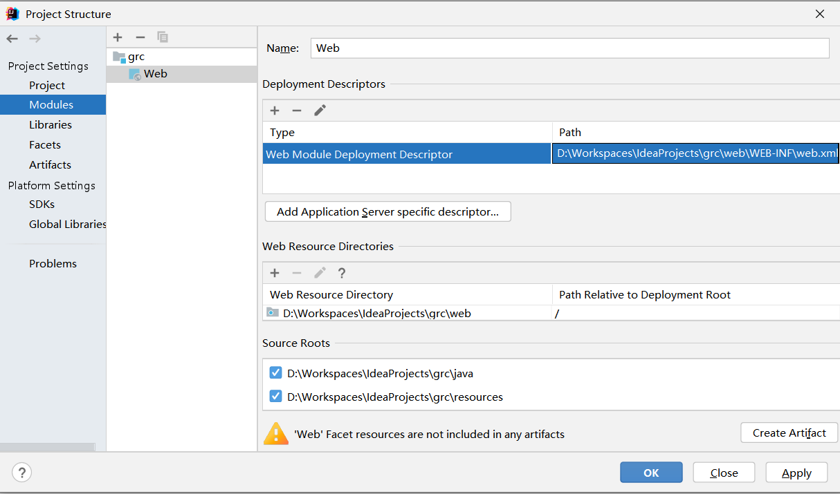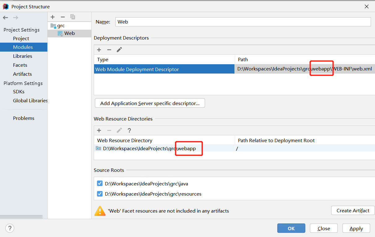默认配置的模块部署描述文件是web.xml,部署资源目录是web,我的web.xml和资源目录是webapp,所以要改一下(有的叫WebContent,根据实际情况设置)