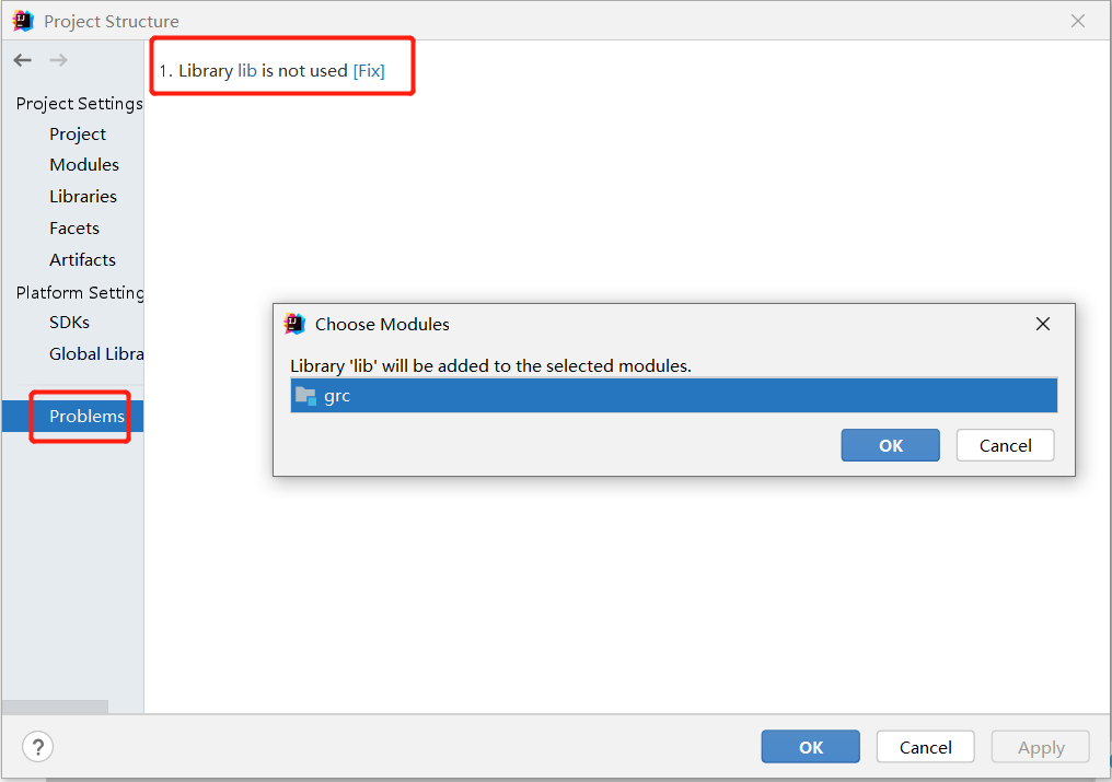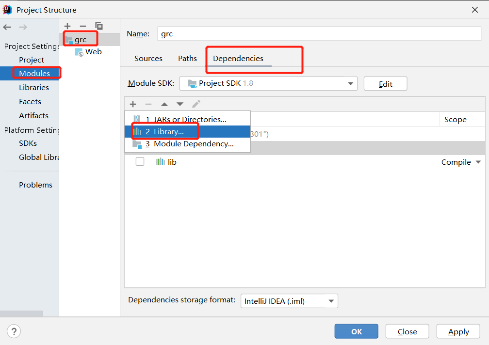 如果发现找不到库可以在模块中的依赖里设置,有我们刚刚设置的lib库