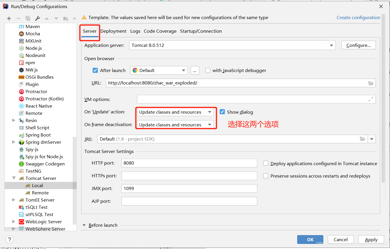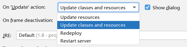 2.update classes and resources ---- 更新java,jsp和静态资源( 1. java修改后,会被编译成.class,然后覆盖到target/kao文件夹下,IDE调试模式的情况下,立即生效。IDE运行模式下,不立即生效,需要redeployed才可生效。jsp修改后,再次被访问的时候,会自动更新,重新编译成java.class保存在tomcat的work目录下。由于是访问时才检测是否修改,是否需要重新编译,所以 IDE 运行模式 和IDEA调试模式下,都是立即生效。刷新下页面就可);如果选择不带exploded形式的模式是没有Update classes and resources这个选项的