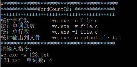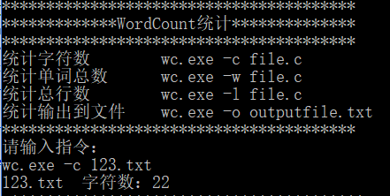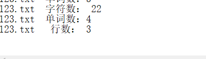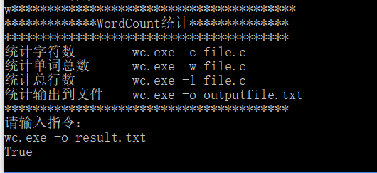 运行代码,可以实现对字符数、字数、行数的统计,并且可以把统计结果保存到result.txt中。可以单独输入一个命令,也可以一起输入,也具有对错误输入的提示。
