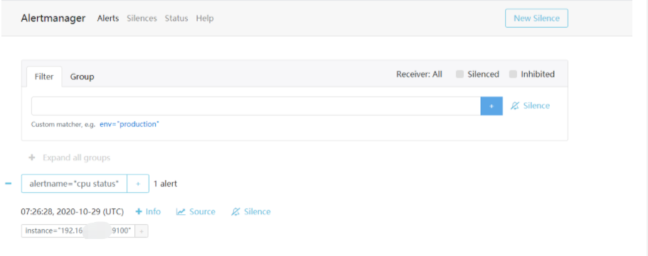 这个时候再访问 Alertmanager,可以看到 Alertmanager 已经接收到告警了: