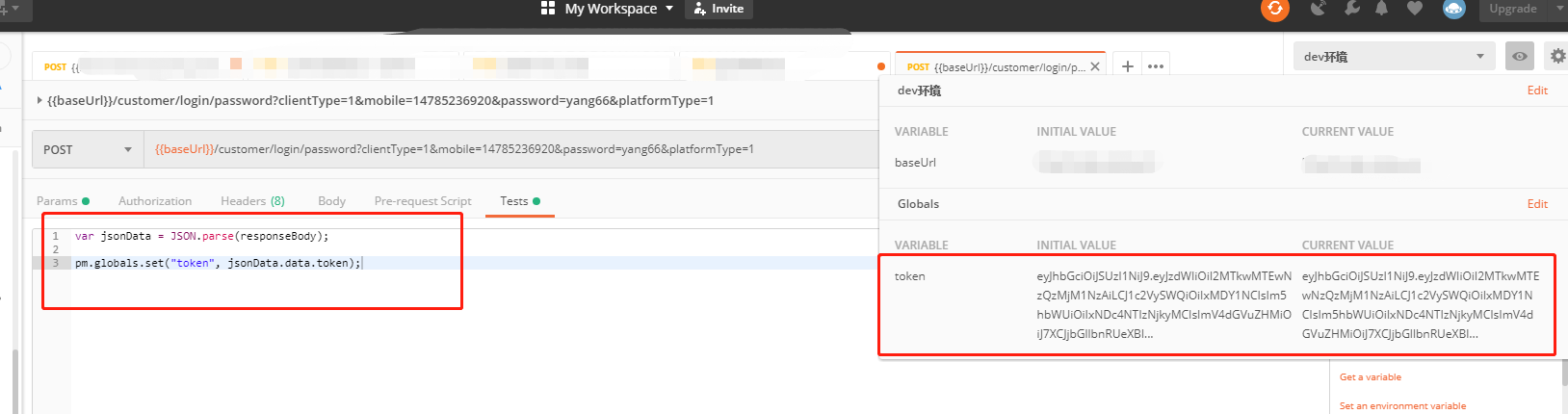 postman中将token设置为全局变量