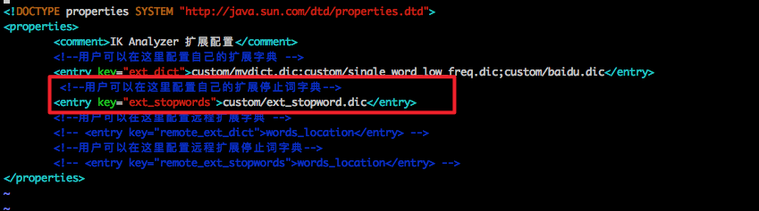 ik插件的配置在 $root/es/plugins/analysis-ik/config/的 IKAnalyzer.cfg.xml 中,
