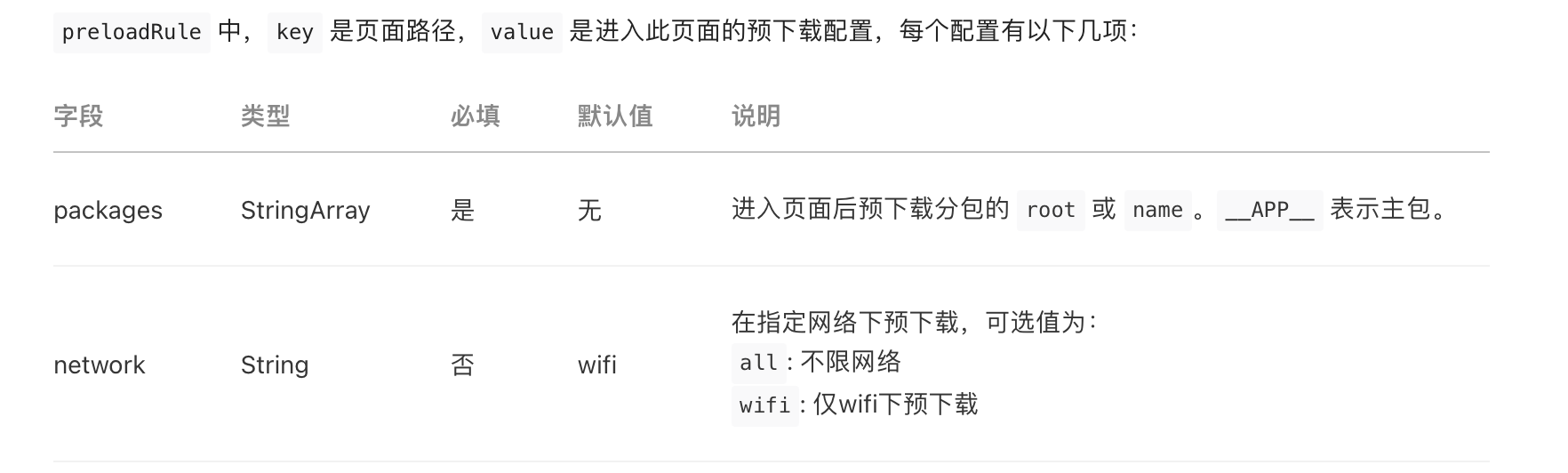 { "pages": ["pages/index"], "subpackages": [ { "root": "important", "pages": ["index"], }, { "root": "sub1", "pages": ["index"], }, { "name": "hello", "root": "path/to", "pages": ["index"] }, { "root": "sub3", "pages": ["index"] }, { "root": "indep", "pages": ["index"], "independent": true } ], "preloadRule": { "pages/index": { "network": "all", "packages": ["important"] }, "sub1/index": { "packages": ["hello", "sub3"] }, "sub3/index": { "packages": ["path/to"] }, "indep/index": { "packages": ["__APP__"] } } }