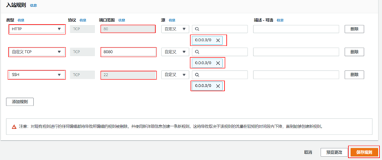 - 控制台 –> EC2 -> 安全组:增加80、22、8080 端口规则