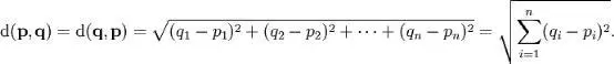 使用这个公式,我们现在可以计算上文中的欧氏距离
