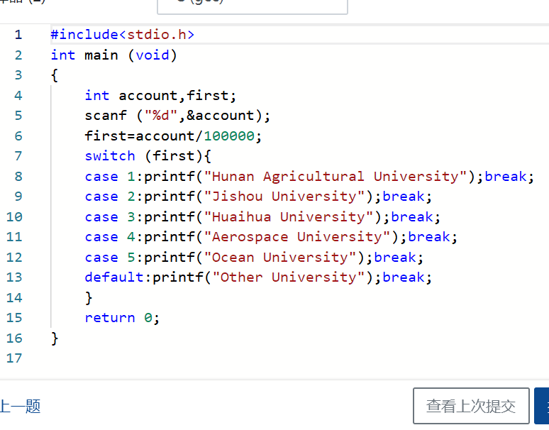 自从湖南农业大学、吉首大学和怀化学院组织程序设计课程联考以后,举办联考的经验越来丰富。尤其是在使用PTA系统作为考试平台之后,联考工作得到了很多学校的认可和支持。所以,现在参与联考的学校比较多。为了便于区分考生,考生账号的第一位##是学校代号。1代表Hunan Agricultural University,2代表Jishou University,3代表Huaihua University,4代表Aerospace University,5代表Ocean University。 请编写程序根据考生的账号区分考生的学校。