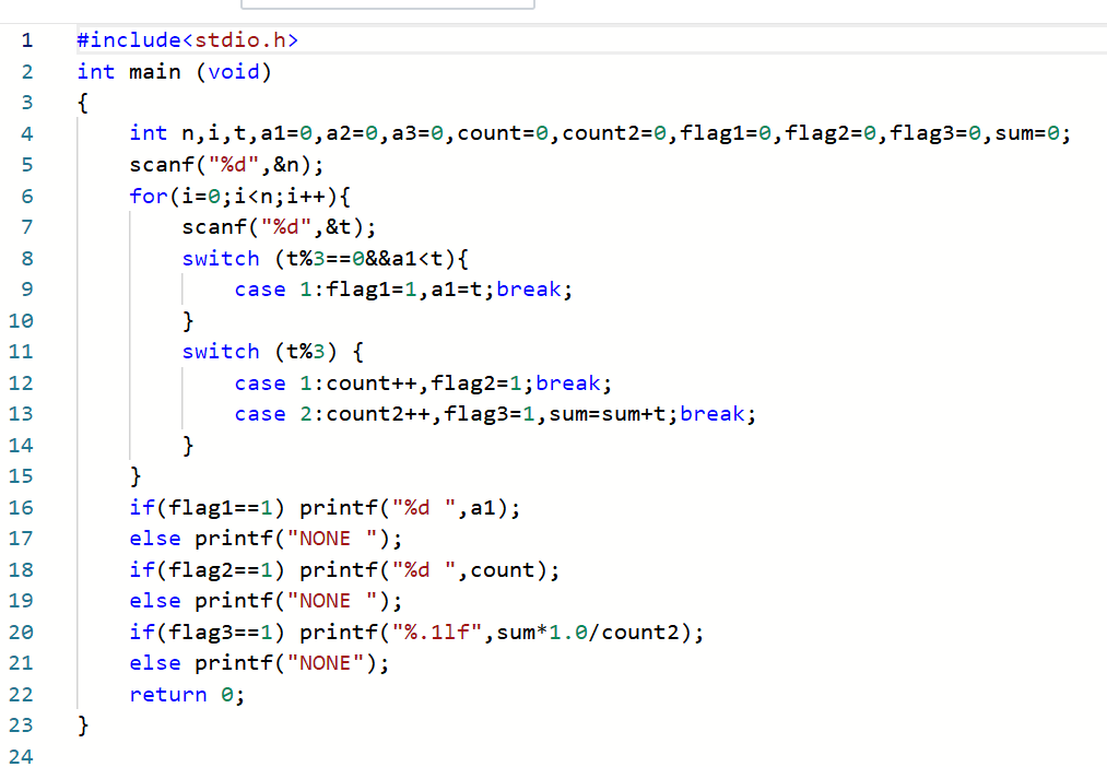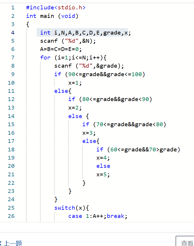 答: int i,N,A,B,C,D,E,grade,x,再运用scanf函数,使用for循环,再用if-else语句,最后使用switch语句