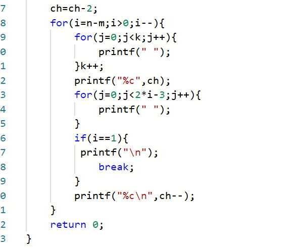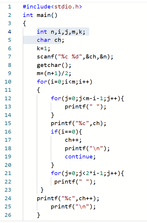 输入在一行中给出起始字母(范围为英文大写字母A-G)和菱形的高度(为不超过10的奇数)。