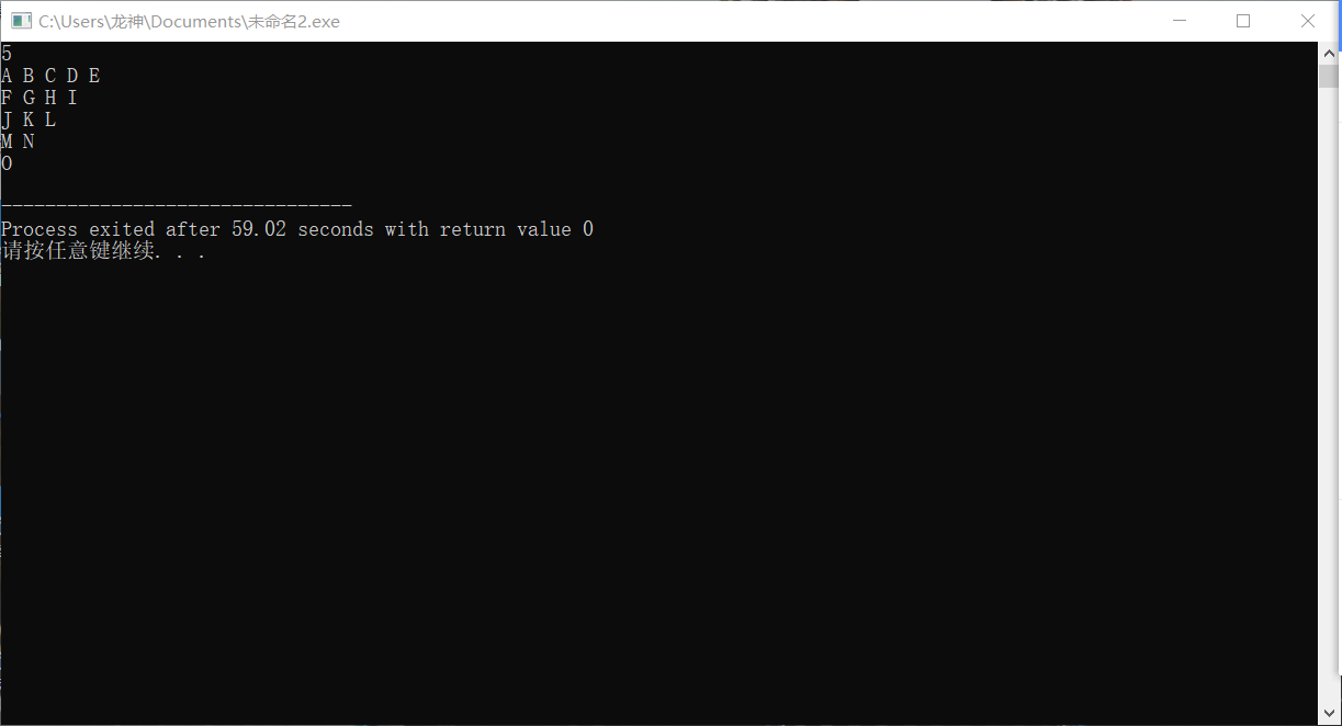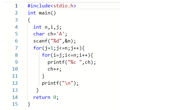 输出n行由大写字母A开始构成的三角形字符阵列。格式见输出样例,其中每个字母后面都有一个空格。