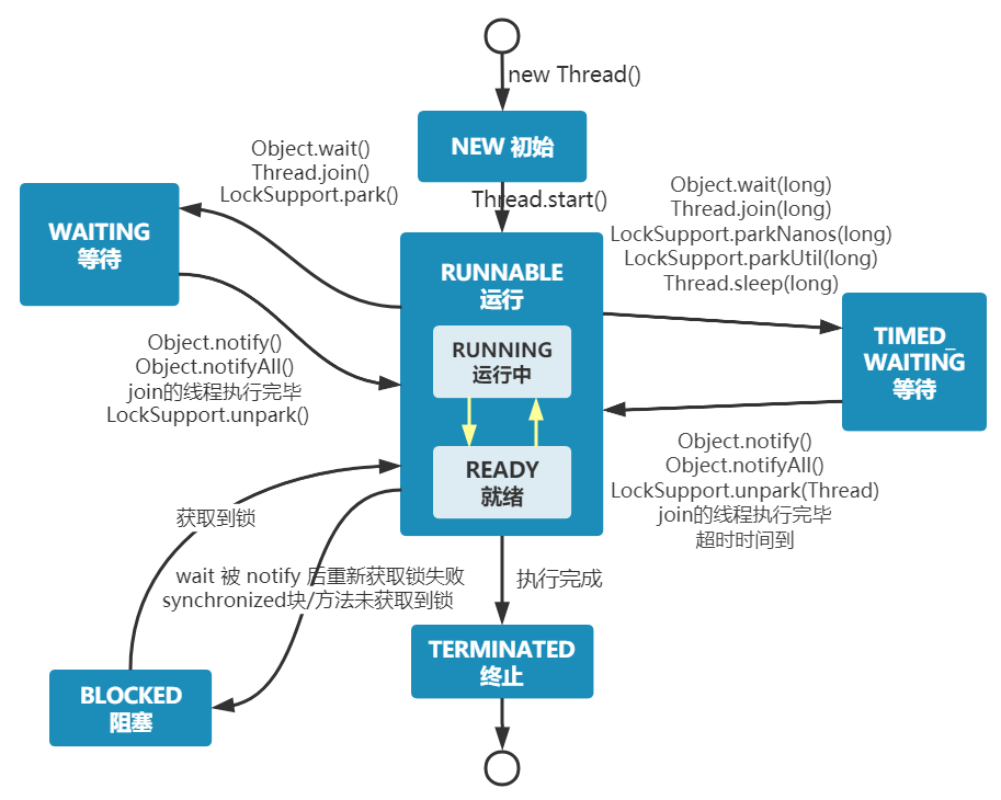 - 因为 现在的 CPU 都讲 CPU 资源进行分片循环调度,由于时间片非常小一般是 10~20ms,线程切换的非常快所以区分 Ready 和 Running 意义不大