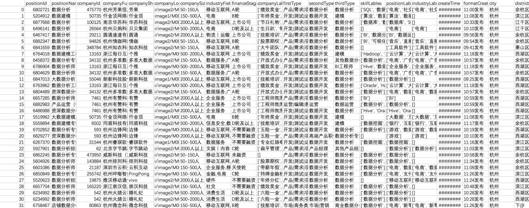 本文在拉勾网招聘信息中选择北京、上海、广州、深圳、杭州这五个城市下分别以数据分析师、算法工程师为筛选条件来采集样本,采集到的原始数据如下