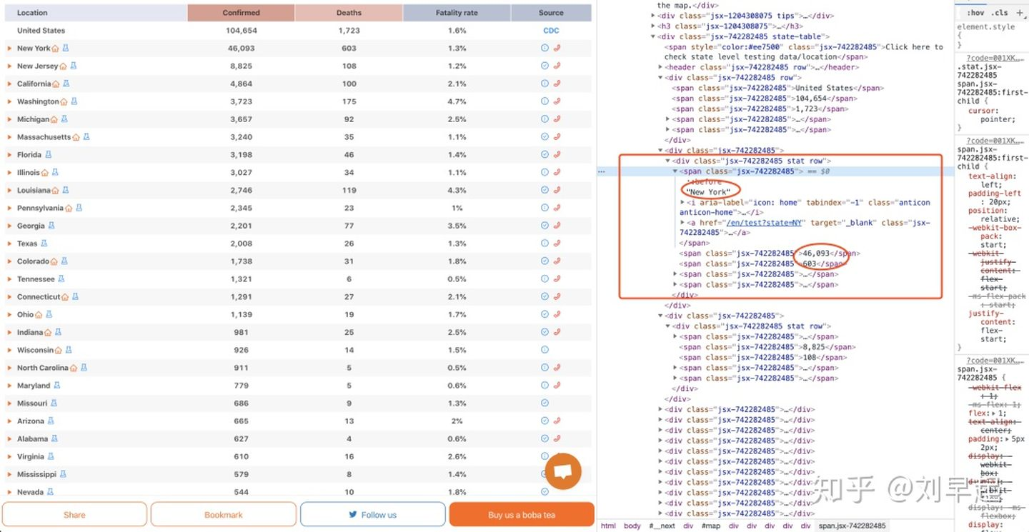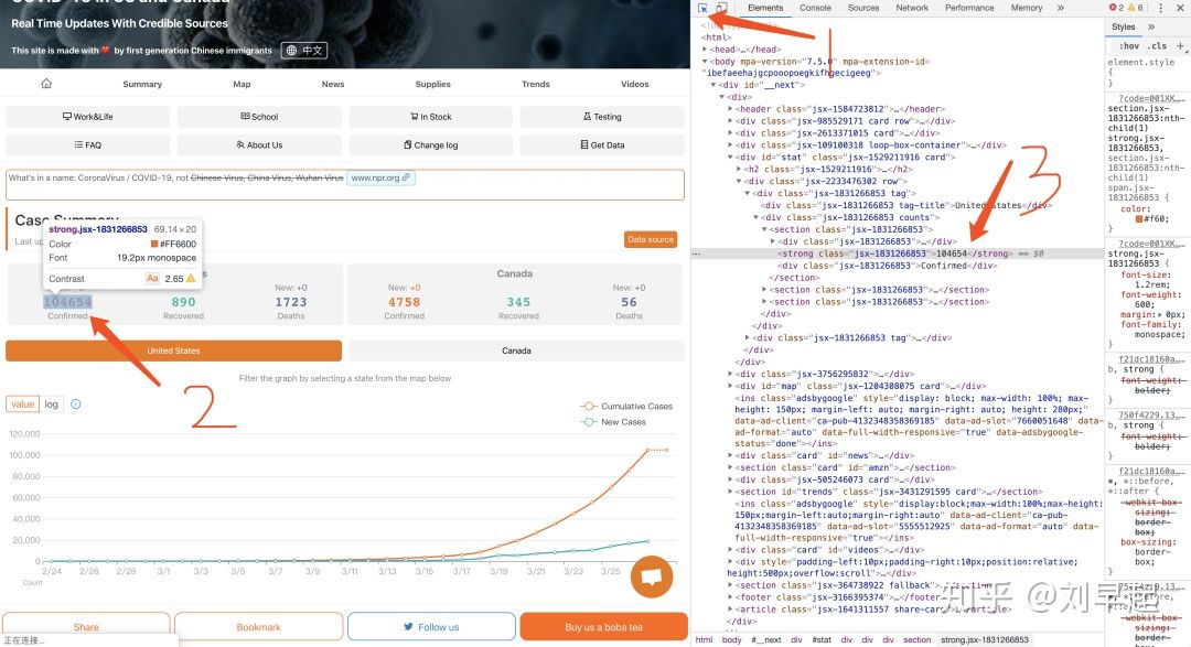 为了再照顾一下不熟悉的读者,我已经标注了你F12之后要干嘛,先点击位置1处的小箭头,它就变成了蓝色,再点击页面中美国确诊的总人数的数字,你戳它一下,右边的页面就会自动定位到前端页面中该数字的位置,从标注3中可以看到这个数字被存储在一个名为strong的标签中,并且class属性为jsx-1831266853,OK请执行下面代码