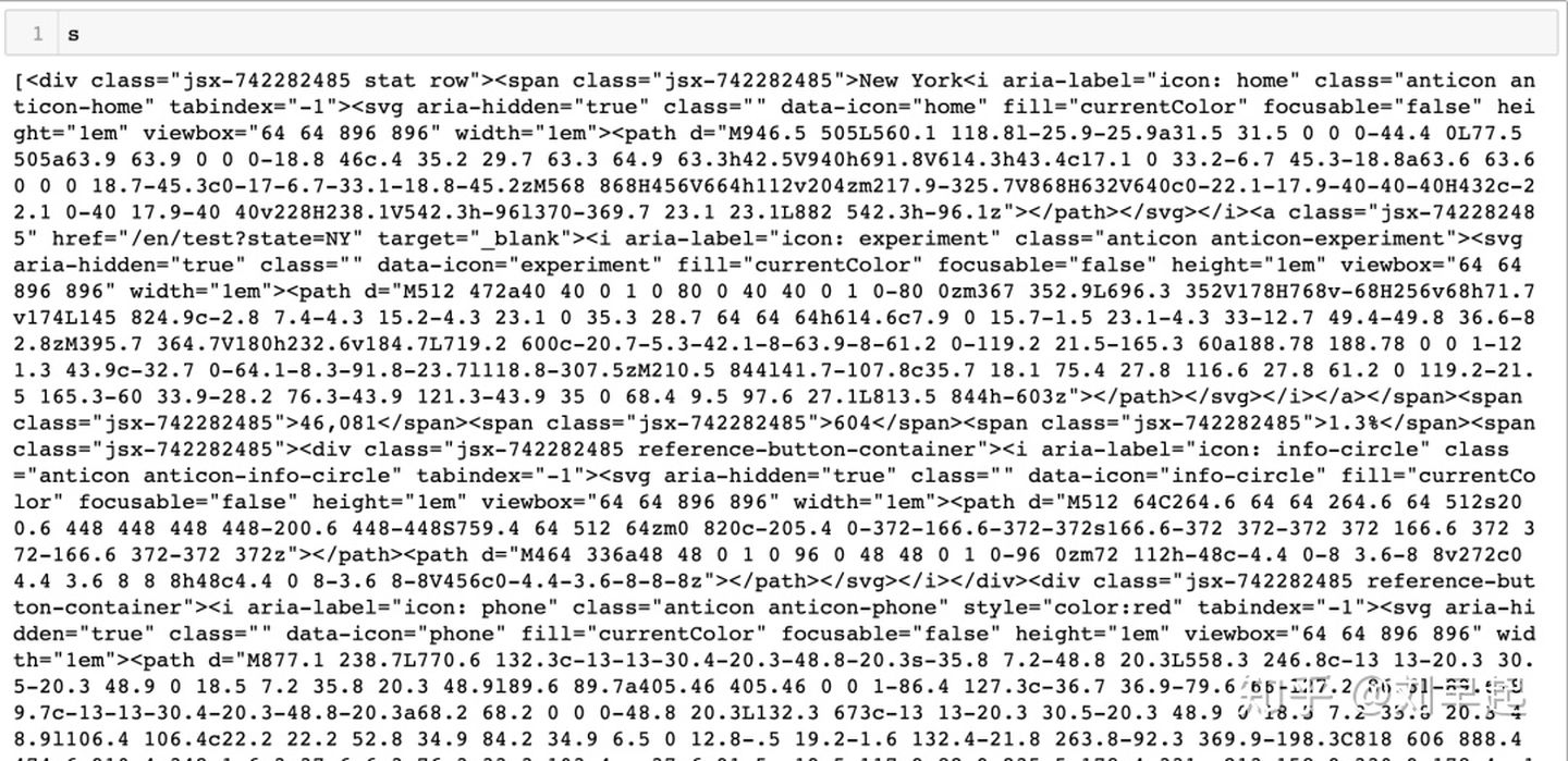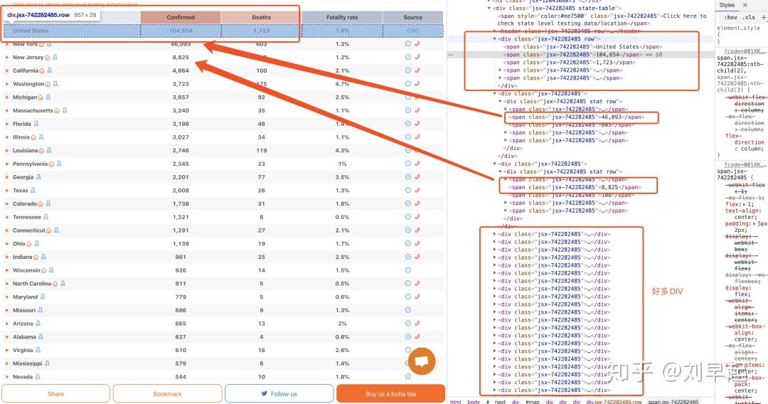 让我们故技重施👆,回到浏览器页面中,F12定位到各个州的位置,戳一下看看数据存储在哪些标签中,看不懂的话回去看上一张图,结果我们发现好多div啊,点开一个就是一行数据,再观察观察发现每一行的数据都被一个属性是class="jsx-742282485 stat row"的标签包住👇