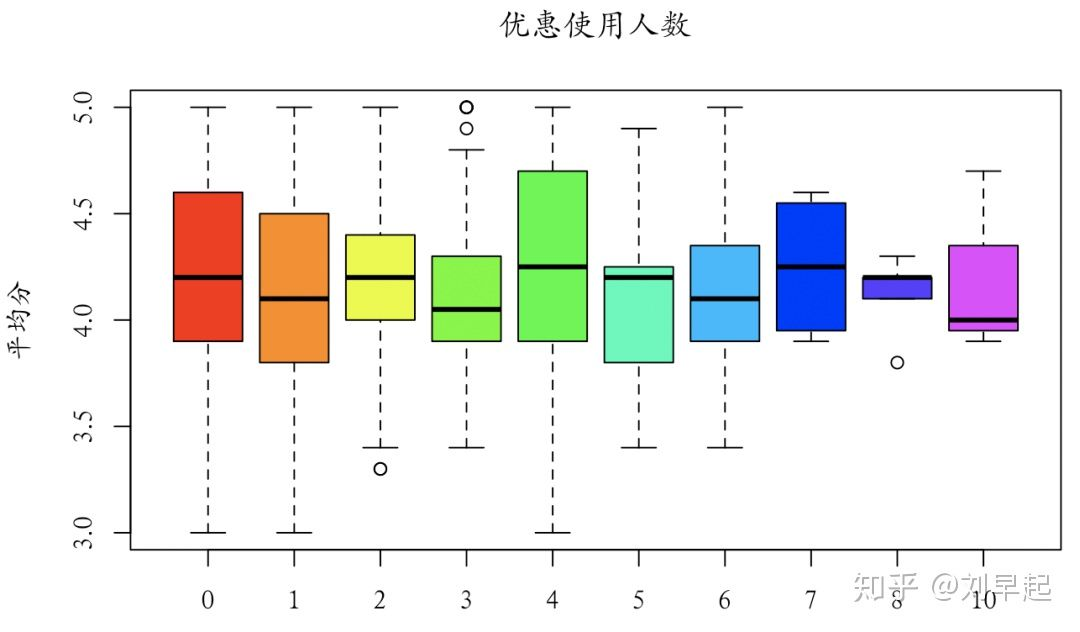 在这一节我们将使用箱线图对影响美食销量、评分的相关因素进行分析,先来看下评分相关的因子,首先来看下店铺优惠限制使用人数对评分的影响